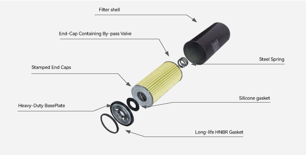 The Material of oil filter is choose HV companyʼs ultra fine glass fiber composite filter material or Korean Ahlstrom companyʼs